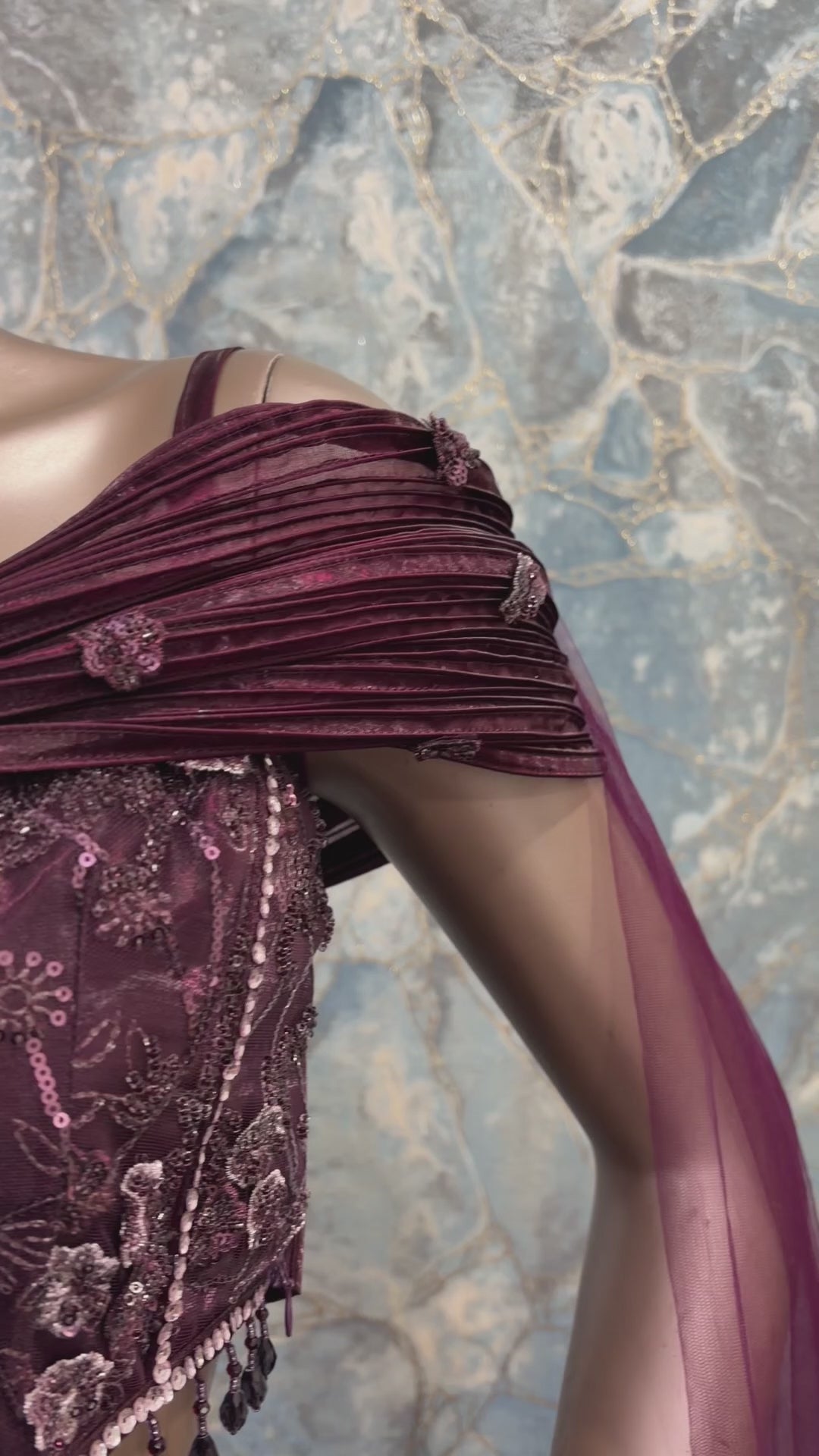 Make a bold yet elegant statement with this wine-toned indo-western mermaid set, designed for evening celebrations and special occasions. The ensemble features a beautifully embroidered blouse adorned with delicate floral motifs and subtle sequin detailing, adding richness and depth to the look.